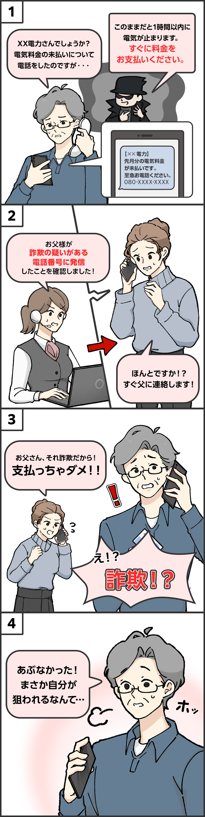 ファミリープラン Plusで提供される「安全確認連絡サービス」では、特殊詐欺の疑いがある電話番号へご家族が発信した際に、サポートセンターで検知!※1