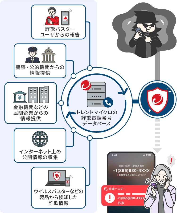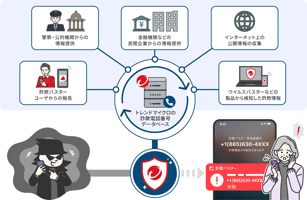 受信したSMSやアクセスしたWebページなどのユーザ行動から、詐欺の手口に似たパターンを見つけてアラートを表示します。